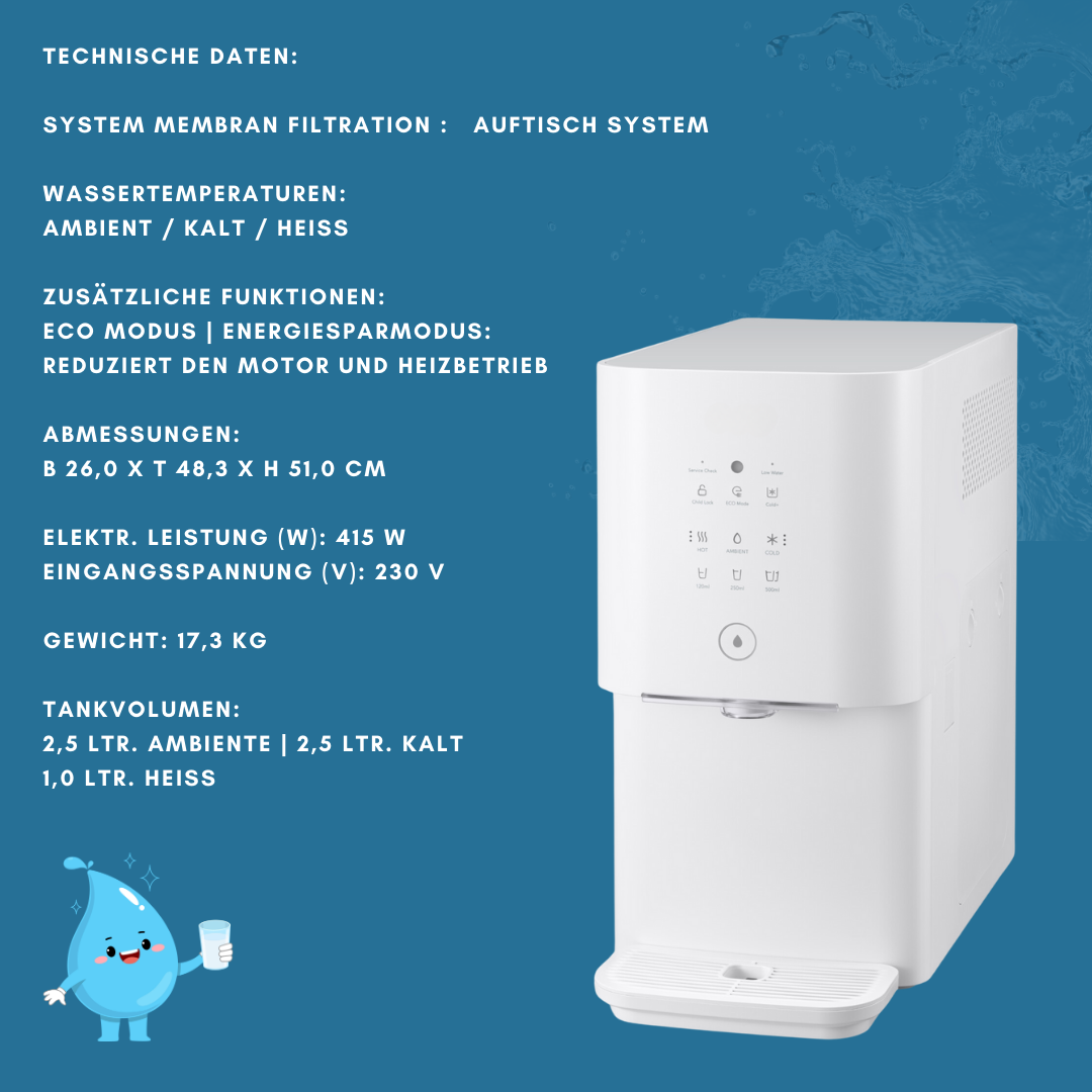 Tankvolumen: 2,5 Ltr. Ambiente | 2,5 Ltr. Kalt | 1,0 Ltr. heiß