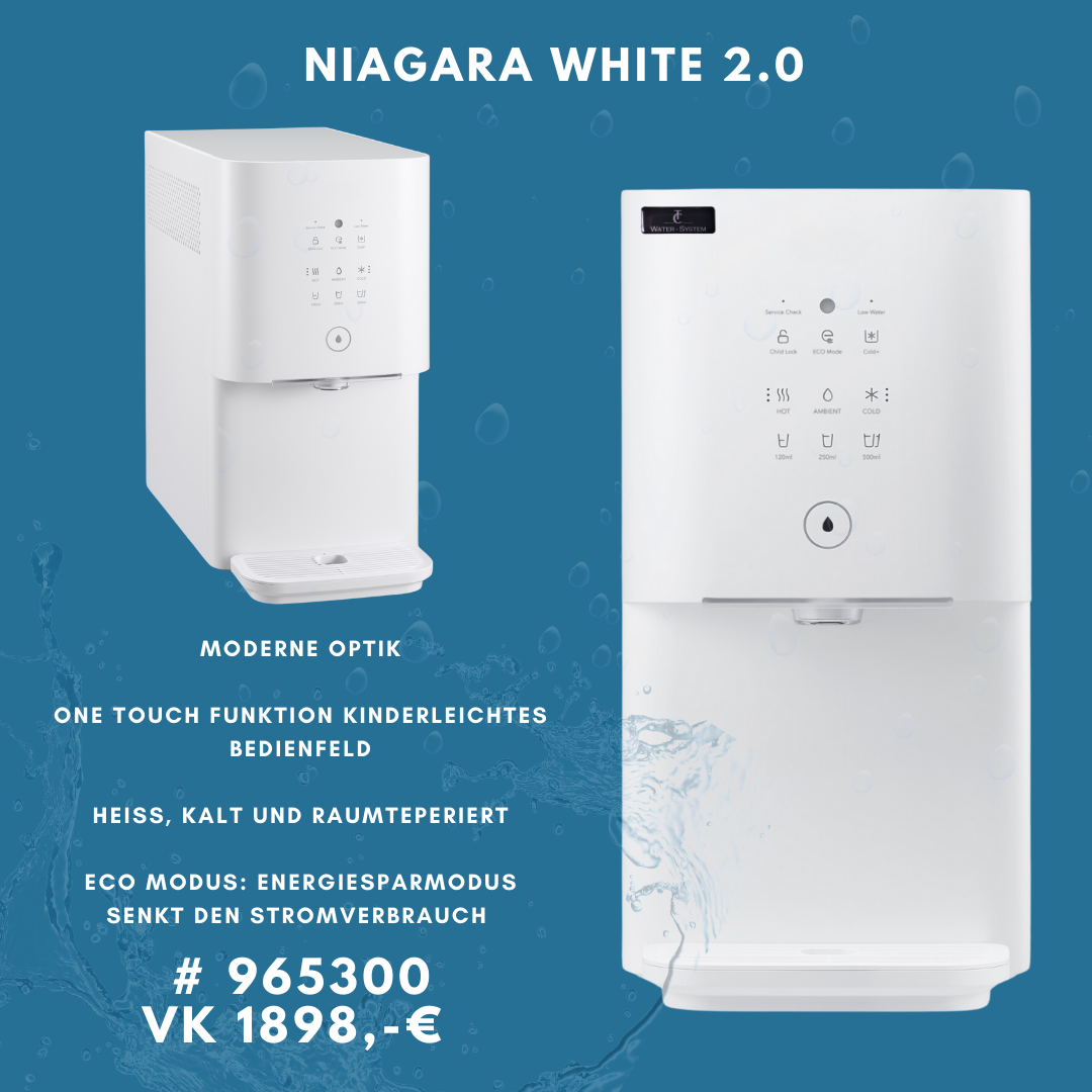 Diese high-class Wasseraufbereitungsanlage hat eine hochwertige Touch-Oberfläche und lässt sich kinderleicht bedienen. Die Niagara white 2.0 stellt raumtemperiertes, gekühltes und heißes Wasser bereit. Wie bei unserem Premium Produkt hilft die Stand-by Funktion Strom zu sparen.